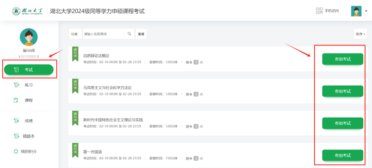 2.1 考生进入考生中心后点击左侧“考试”,选择相应科目点击右侧“参加考试”即可进入考试。